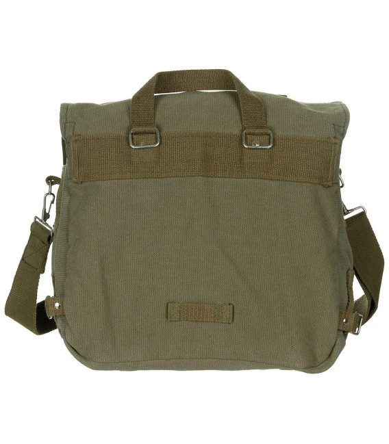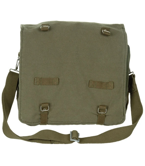 Sac résistant fabriqué en canvas Couvercle avec compartiment et 2 sangles Bandoulière détachable et ajustable Poignée Plusieurs boucles et anneaux (D-Ring) Compartiment principal spacieux avec une poche additionnelle 1 poche sur le devant avec bouton dissimulé Dimensions: 34 x 24 x 12 cm Matériel: 100% coton
