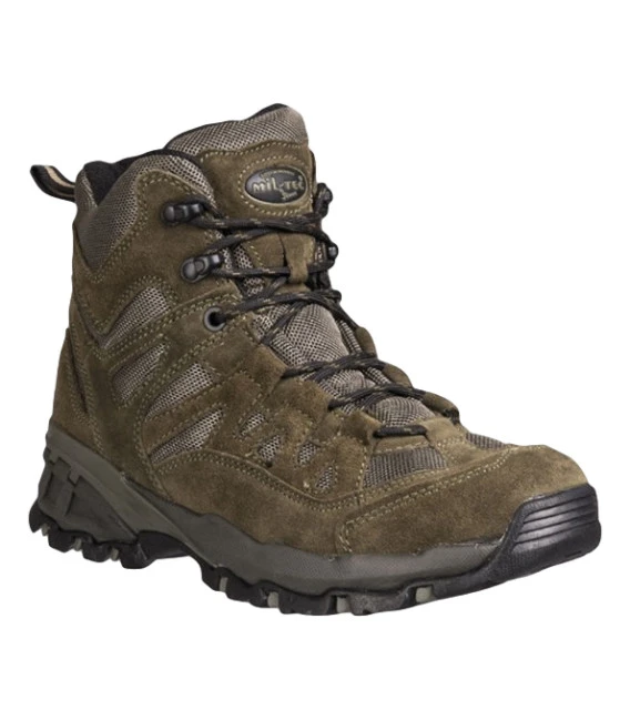Rangers militaires en cuir daim kaki avec semelles intérieures amovibles et à laçage rapide. Le bord de tige est rembourré pour un meilleur confort. La semelle extérieure est très résistante, épaisse et de qualité, pour un isolement du pied contre le froid, l’humidité et les sols durs et accidentés. Les pieds sont maintenus au chaud et au sec pour marcher longtemps.