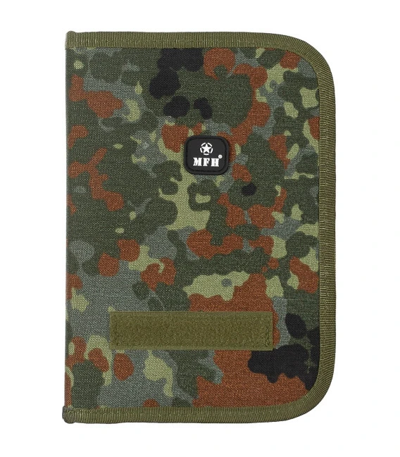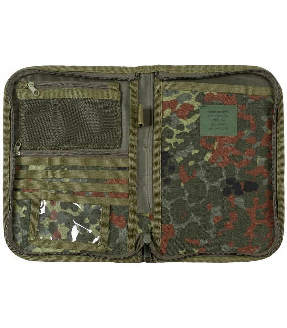 Classeur pratique avec fermeture éclair circulaire 3 compartiments sur le côté gauche 1 pochette pour carte d’identité 1 compartiment zippé et 1 poche en maille avec fermeture éclair 1 poche pour stylo Grand compartiment pour bloc-note sur côté droit Surface velcro pour patch nominatif à l’avant Matériel: 100% polyamide