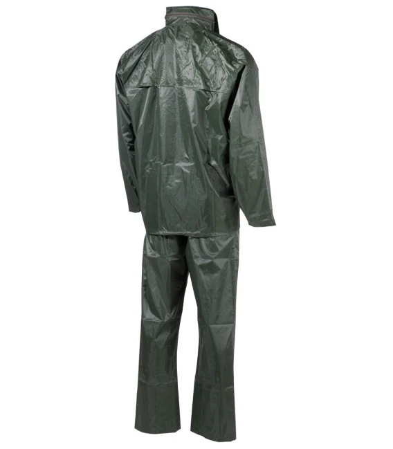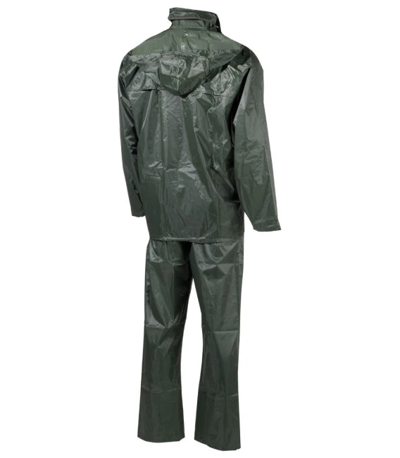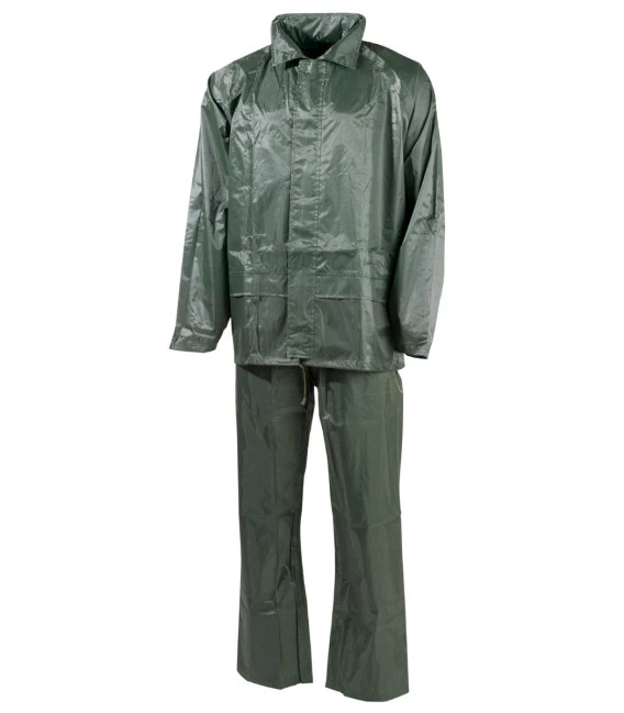 Veste avec frontale fermeture éclair caché et 2 Boutons pressions 2 poches revolver caché Capuche enroulé avec cordon dans le col et avec fermeture éclair Aération du dos avec insert en filet Curseur de ventilation dans les aisselles Boutons pressions sur l’ourlet et Cordon à la ceinture pour réglage de la largeur Pantalon avec taille élastiquée 2 poches latérales Boutons pressions sur l’ourlet du pantalon pour réglage de la largeur Matériel : 100 % polyester