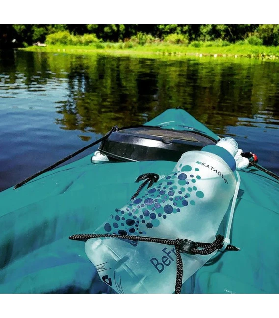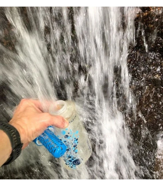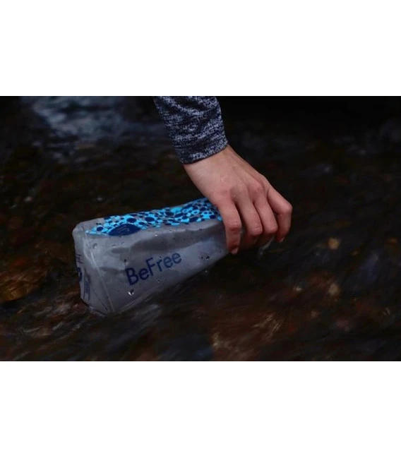 filtre compacte et ultra léger avec débit rapide idéal pour une personne faire de la marche, escapades citadines, etc. Grâce à la flasque souple se replie et se glisse nimporte où, dans un tout petit espace Il suffit de remplir la gourde deau, de fermer le capuchon et de secouer Autre solution : retirez le filtre de la gourde et rincez-le dans un lac, une rivière ou un cours deau Video: http://bit.ly/BeFreeMFH Dimension: environ 40 x 30 x 10 cm Poids: environ 59 g Matériel: EZ-Clean Membrane à fibres creuses Hydrapak SoftFlask à TPU, 100% PVC et sans BPA