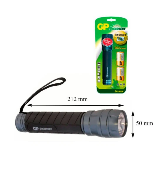 Cette nouvelle lampe garantit une qualité d éclairage exceptionnelle, grâce à sa LED CREE 5W, jusqu à 90 fois plus brillante qu une LED standard. Sa coque en aluminium anodisée durable est très solide et résiste très bien aux chocs et à la pluie. Son grip en caoutchouc antidérapant permet un excellent maintien par tous les temps.Jusqu à 4h d autonomie avec les 2 piles GP Ultra, format D, incluses ø 50 x 212 mm Poids avec piles : 560g Ampoule : 5W CREE LED 50.000hLuminosité : 180 Lumens Intensité lumineuse : 8000cd Portée d éclairage : 180mAutonomie : 4h (avec piles GP Ultra Alkaline) Piles : 2 x D (incluses) Garantie 2 ansGPBM®