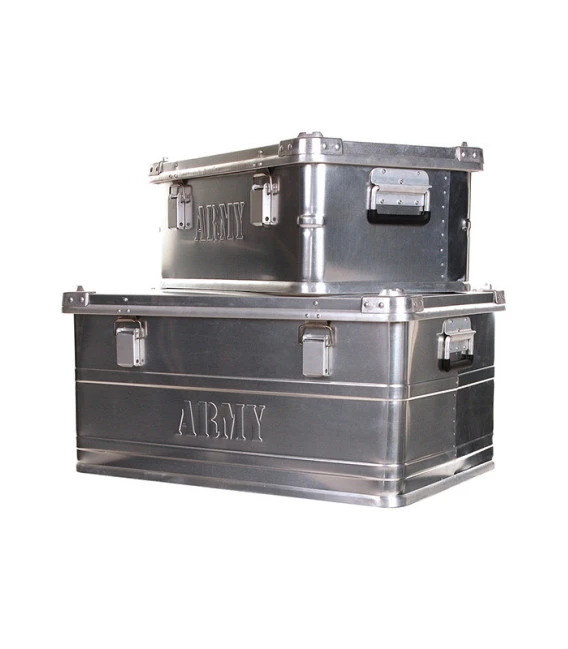 Lot de 2 caisses cantines militaires de 56 litres et 125 litres pour le rangement et le transport d’affaires lors d’une excursion, mission ou opération extérieure. Peut aussi servir pour les particuliers pour faire de la randonnée ou du bivouac par exemple. Les cantines sont rigides et résistantes et leur matériau en aluminium très léger permet une excellente protection des affaires contre la pluie et l’eau.