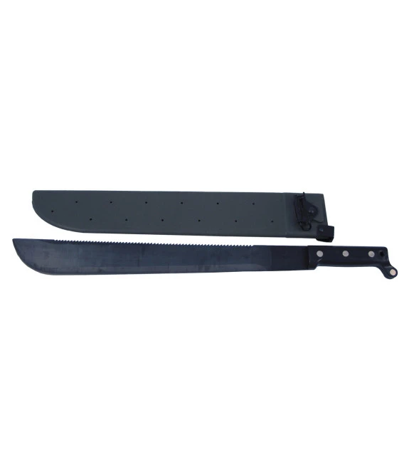 Machette type US, la Bolo de chez MFH offre de belles caractéristiques. Citons tout d’abord sa longueur de lame de 45,5 cm permettant de couper de nombreux branchages d’un coup. Le dos de la lame est denté afin de permettre de couper des branches. Un étui rigide de protection en plastique est fourni.