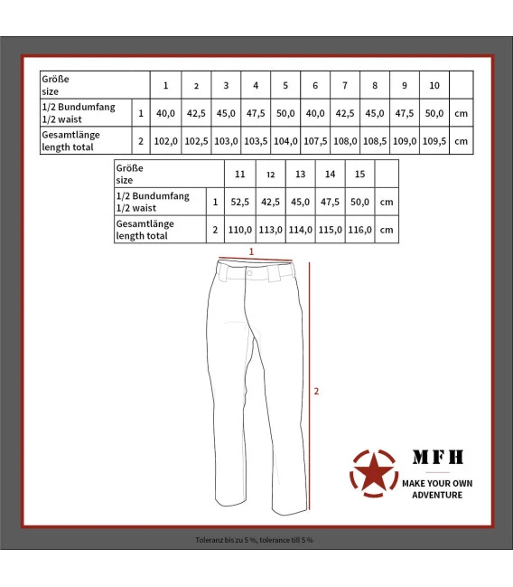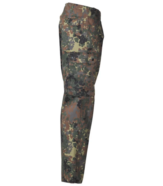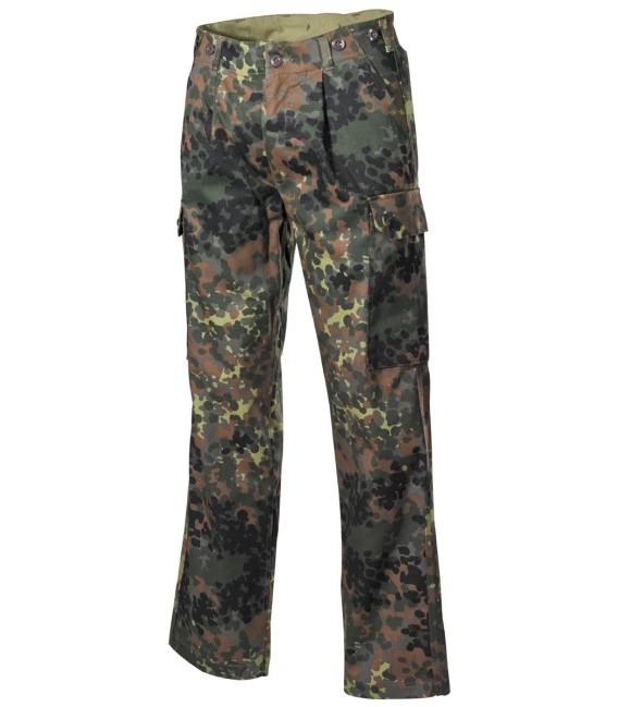 Pantalon à motifs camouflage Elaboré selon les conditions techniques de livraison de la Bundeswehr (BW) 2 poches laterales, poche arrière, 2 poches de jambes sous rabat boutonné, Braguette avec fermeture-éclair Poche revolver avec fermeture à boutons Boucle de ceinture avec largeur de 3,5cm Boutons pour bretelles Matériel: 65 % coton, 35 % polyester
