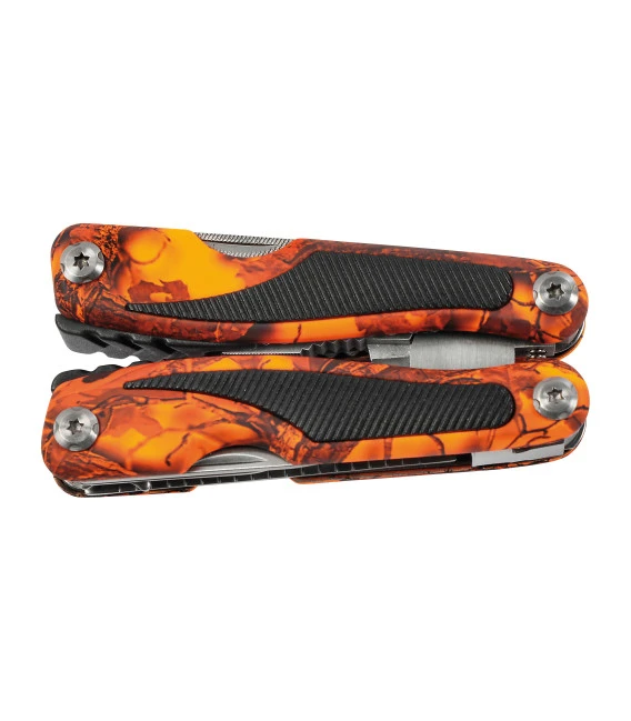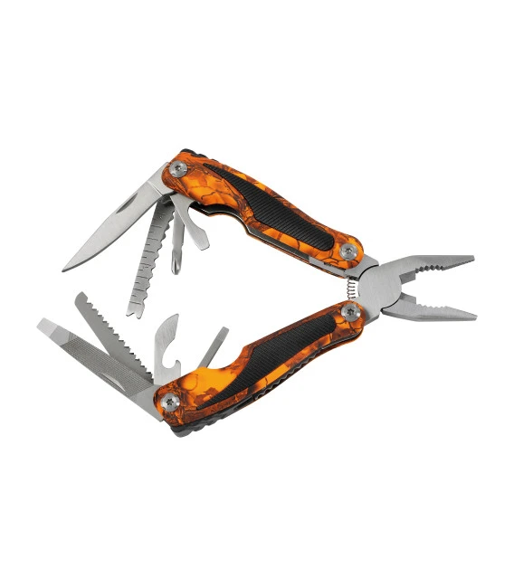 Pince multifonctions avec 8 lames en acier 420 carbone/chrome intégrées dans le manche pliant.Manche ergonomique impression camo blaze. Grip renforcé.Livré sous blister avec étui en polyester.