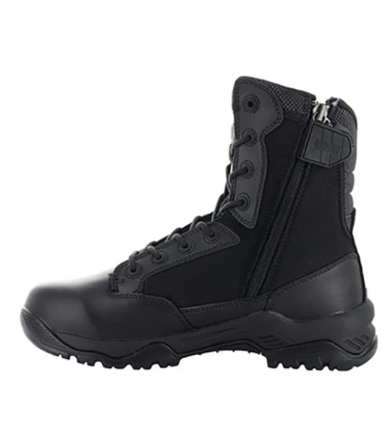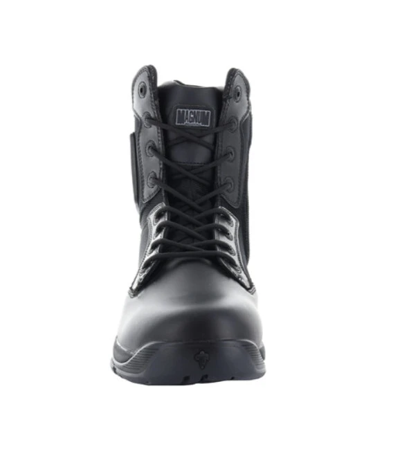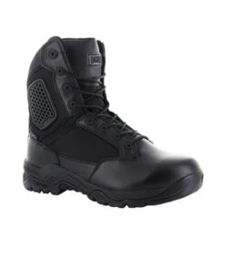Rangers Magnum Strike Force 8.0 type chaussures d’intervention tactiques noires, pour militaires, professionnels de la sécurité et forces de l’ordre. Ces rangers en cuir sont étanches et respirantes, et offrent un maximum de confort avec une protection rembourrée Armourgel® pour les chevilles et une semelle intérieure M-PACT Recoil® qui amortit et absorbe les chocs.