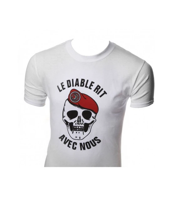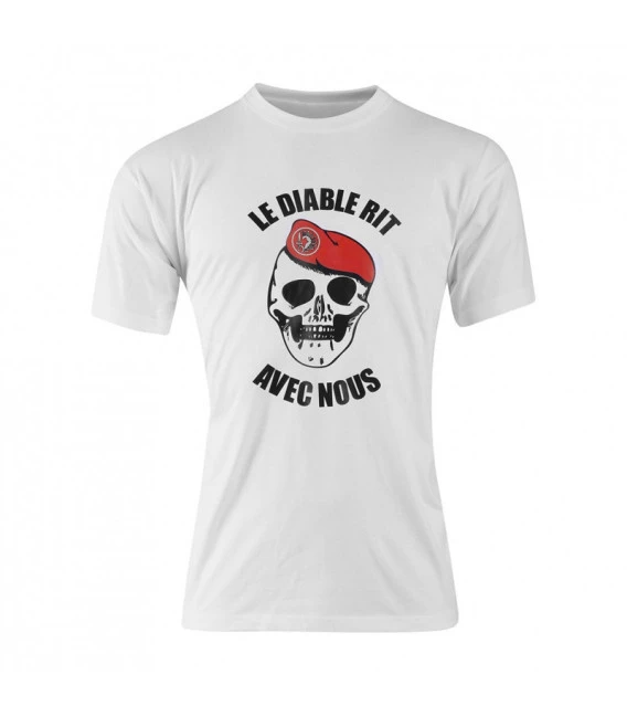 « Le Diable Rit Avec Nous » est signalé sur ce t-shirt de l’armée. Un dicton pour motiver les troupes de parachutistes métro françaises comme en atteste la tête de mort portant un béret en rouge. Ce t-shirt à manches courtes en blanc est en coton et son poids est d’environ 180 grammes.