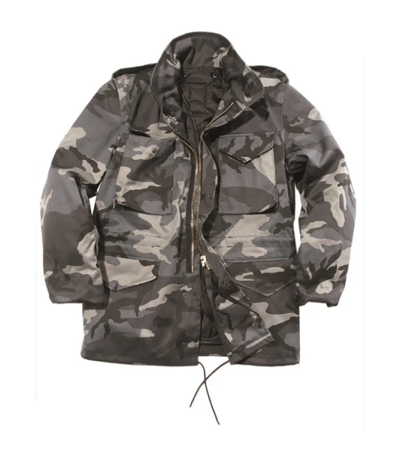 Veste militaire US M65 légère et déperlante, avec une doublure intérieure déboutonnable et une capuche dissimulée dans le col.